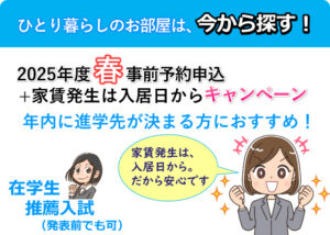 ■ 新入生応援キャンペーン 2026年度春からひとり暮らしのため、部屋をお探しの方に、飯島興産の『2026年度事前予約申込』をおすすめします。 お部屋探しはまだ先でいいかな…とお考えの方も多いかもしれませんが、飯島興産の … 続きを読む 新入生応援キャンペーン