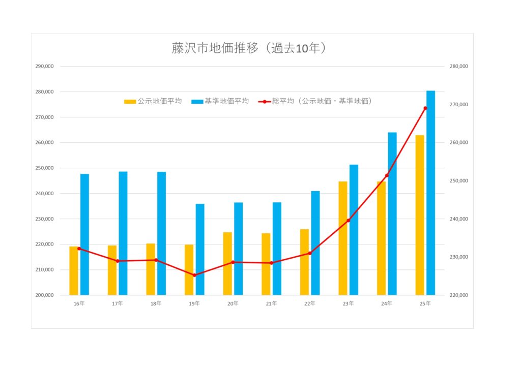 藤沢市の地価の総平均(公示地価と基準地価の平均)は26万9044円/m2(2025年[令和7年])、坪単価では88万9404円/坪です。前年からの変動率の平均は+5.65%の上昇です。