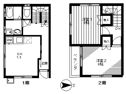 • テラスハウス2DK 3方角部屋 エアコン1基付 浴室追焚き機能