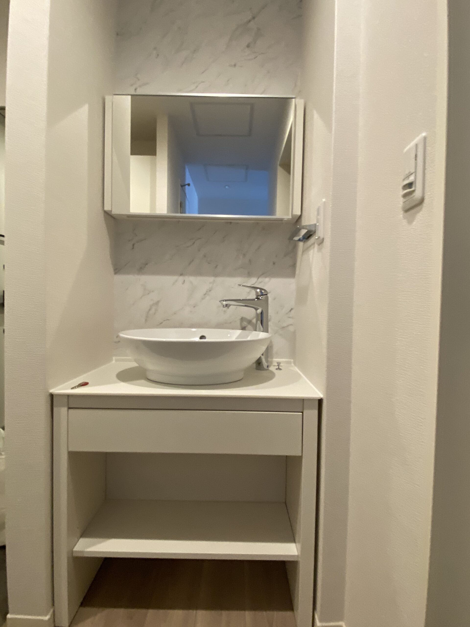 お部屋には洗面化粧台が設置してありますが、洗面所に設置しておりません。理由としては、洗面所に洗面台を設置することにより、洗面所の面積が広くなり、他の箇所が狭くなるからです。