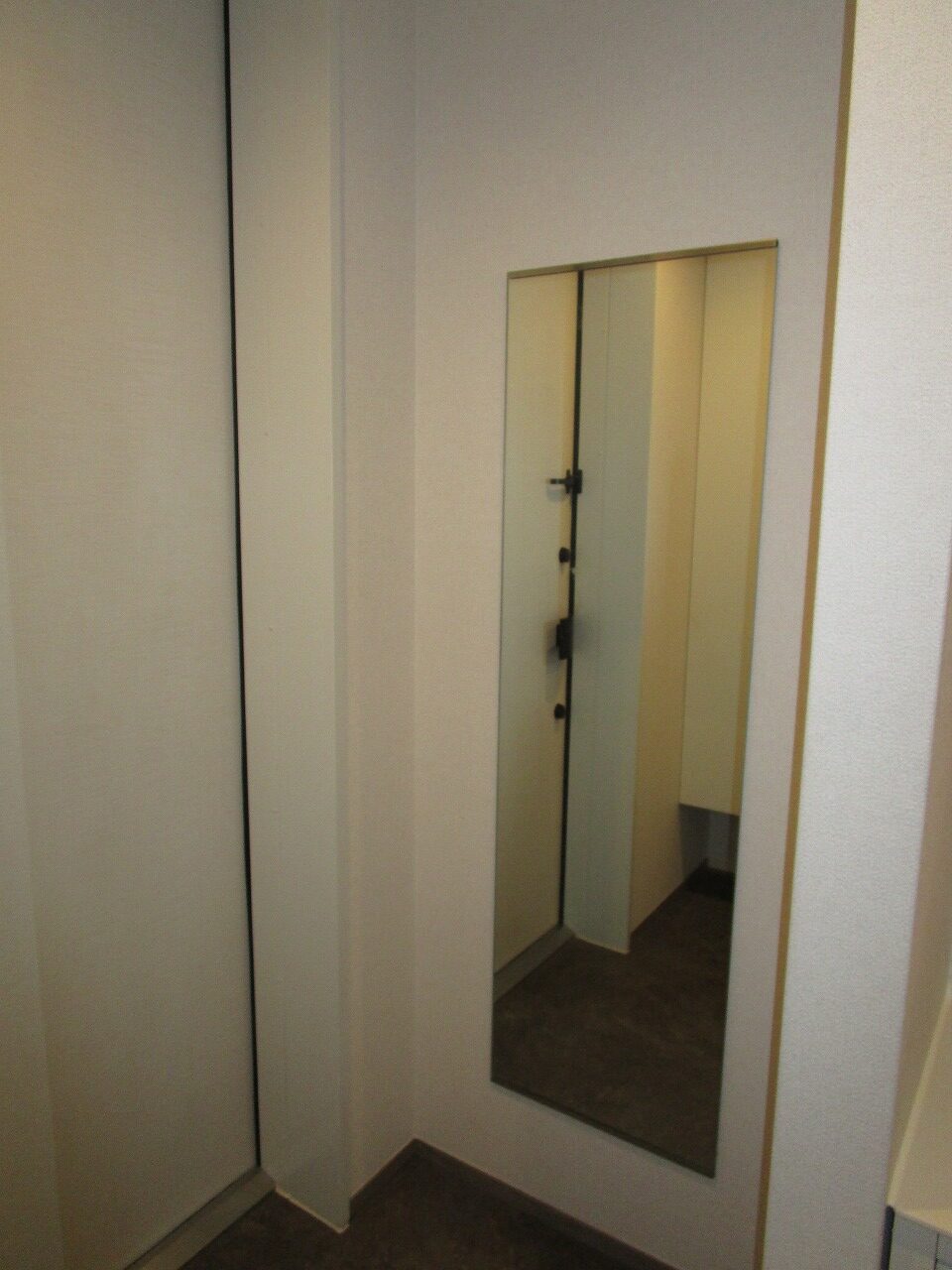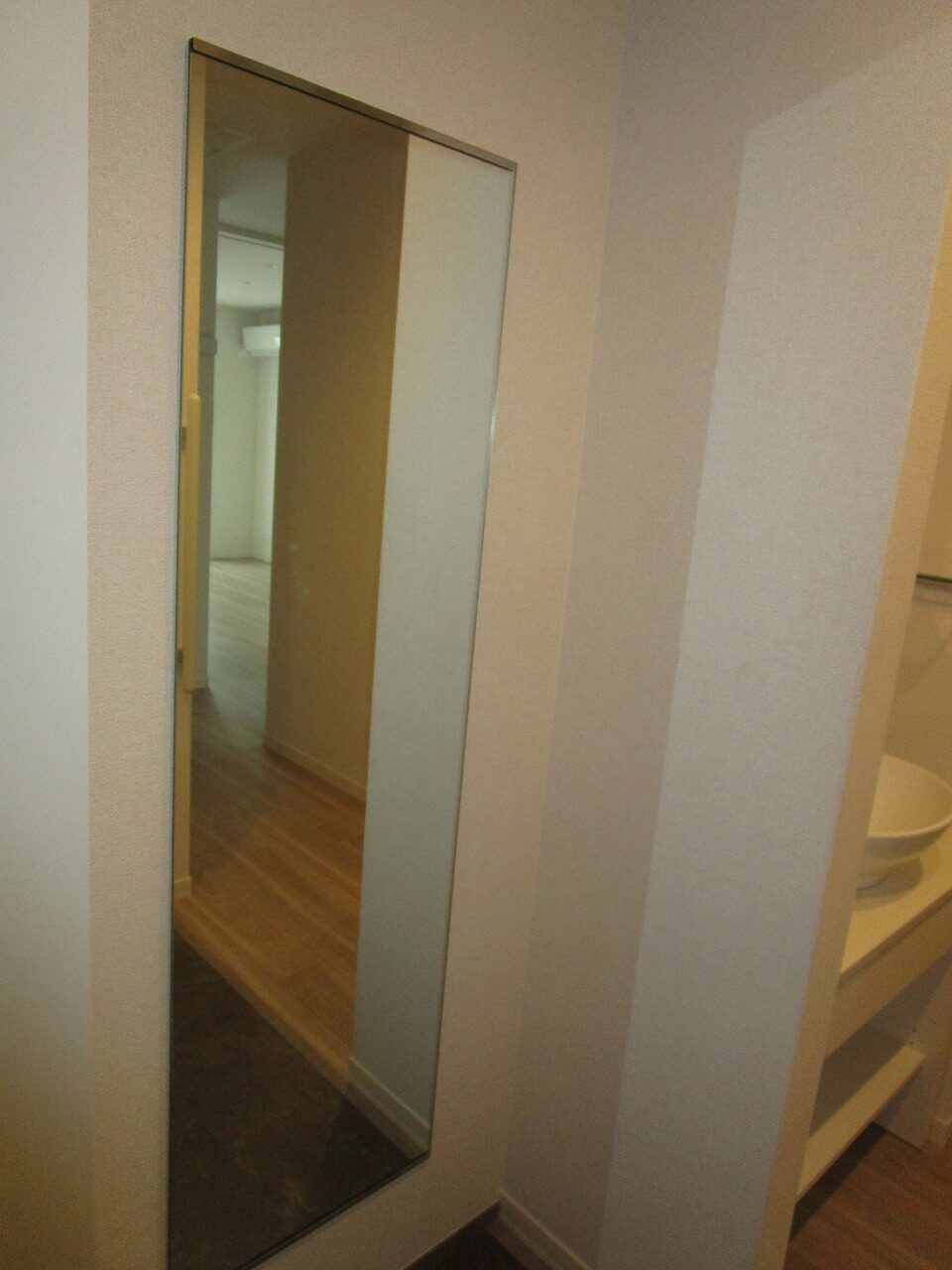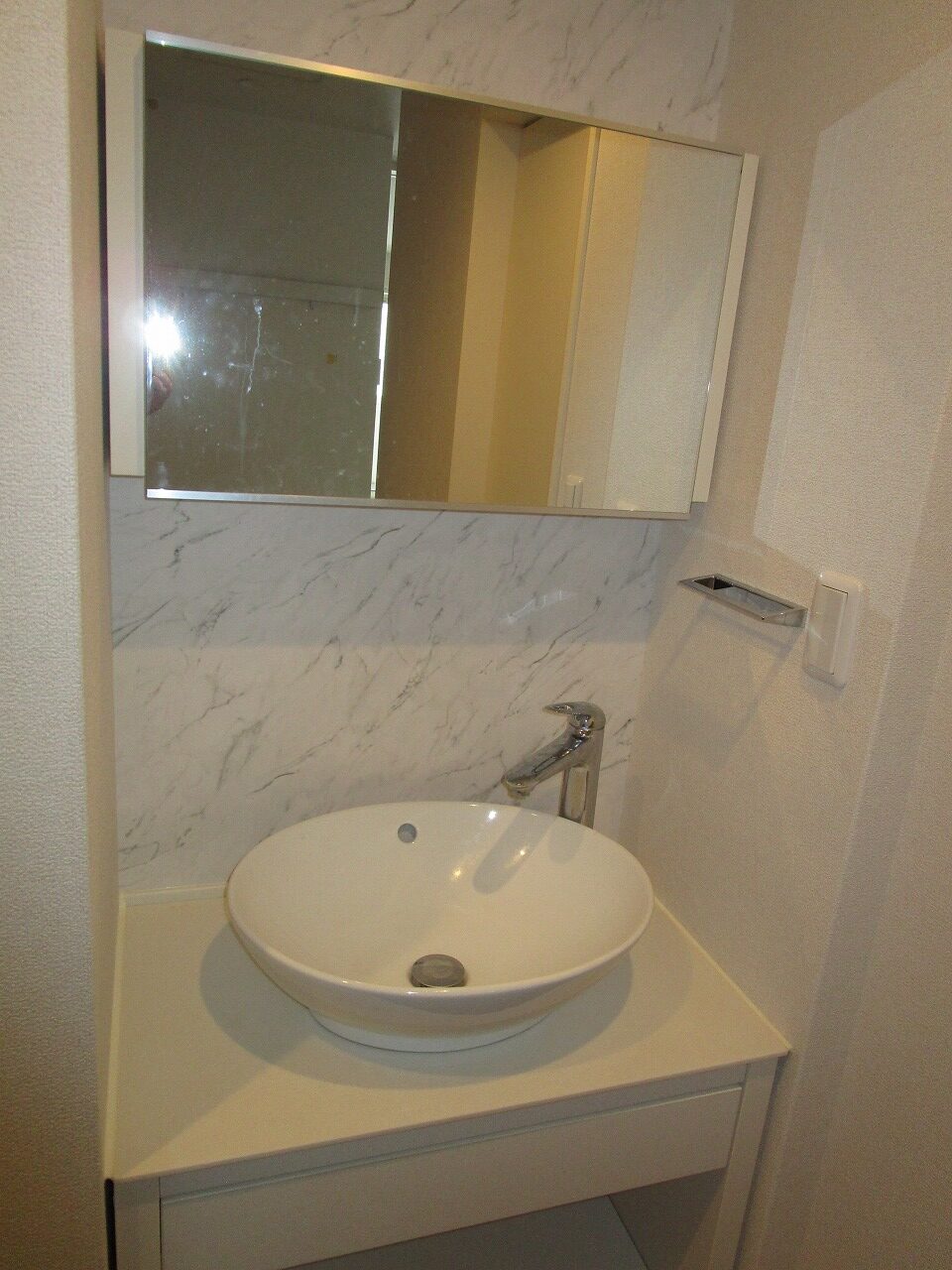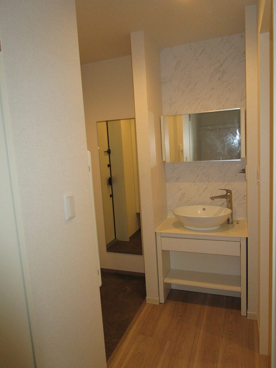 お部屋には洗面化粧台が設置してありますが、洗面所に設置しておりません。理由としては、洗面所に洗面台を設置することにより、洗面所の面積が広くなり、他の箇所が狭くなるからです。