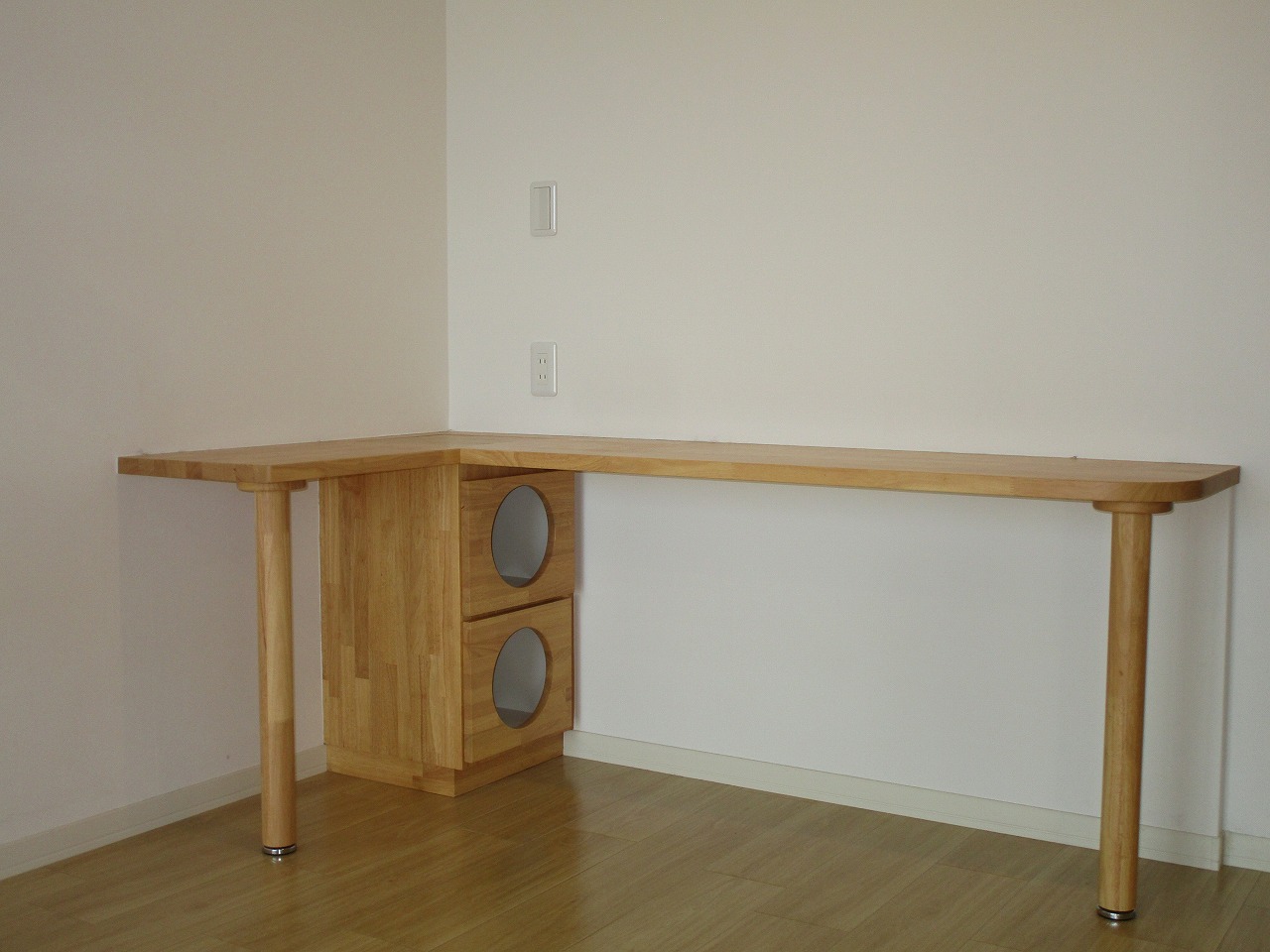 猫ちゃんとの共生マンションですのでキャットウォーク、キャットステップ、猫ちゃんドア、猫ちゃんの隠れスペース、爪とぎ用の柱、猫ちゃんトイレスペース、ベランダに転落防止ネットフックを設置しました。